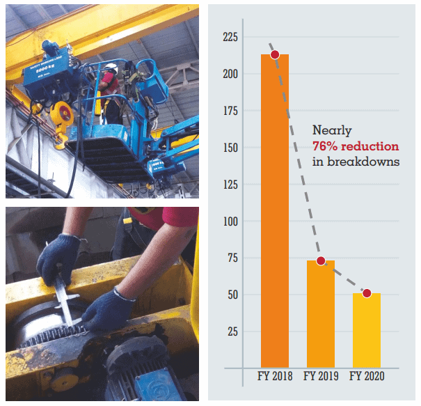 This aspect was identified as a major area of improvement. An Operator Training Programme was conducted by our experts, which explained correct crane operating practices and their importance in ensuring higher uptime and safety. Classroom training along with demonstrations on the shop floor helped operators understand the practices easily